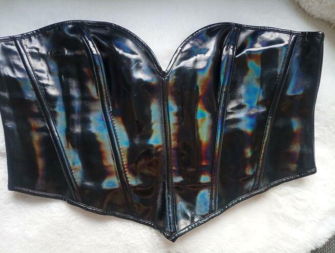 Bardzo ekstrawagancki, błyszczący gorset sznurowany z efektem holo. Mieni się w kolorach rozlanej benzyny. Świetnie ...