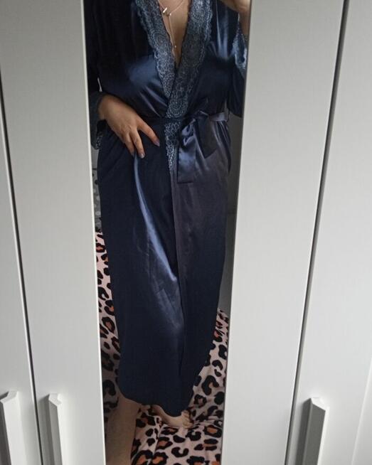 Piękny satynowy szlafrok z koronką w odcieniu jasnego granatu polskiej marki LivCo Corsetti zachwyca elegancja i klasa. ...